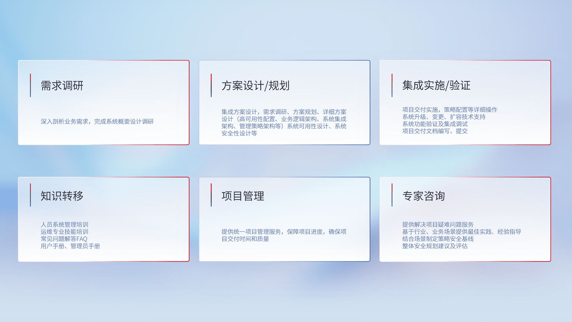 针对客户行业特性,,,,将宏观的安全战略和需求,,,,通过专业的交付服务,,,,实现项目落地,,为客户提供标准规范的集成交付服务。。